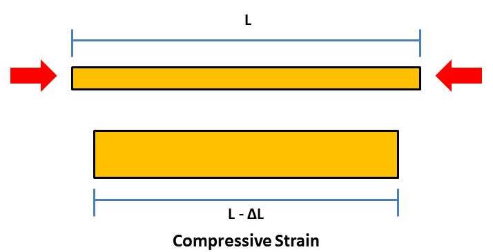 Strain measure under compressive loading is known as compressive strain. It tends to increase the cross-section area and decrease the length of the body.